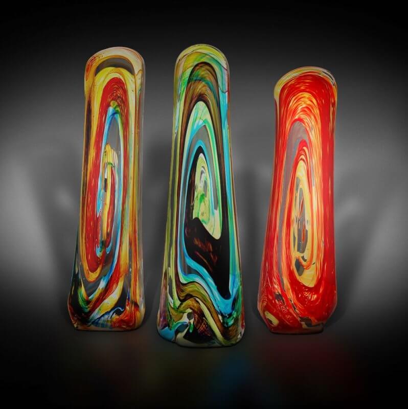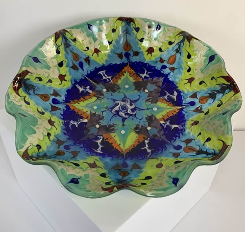 My art consists of fused/kiln-formed glass to create decorative & useful items using glass powders, frit and frit slurries, enamels & cut glass. I also pull cane & vitrograph used for design elements.