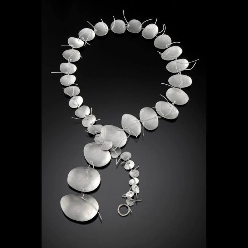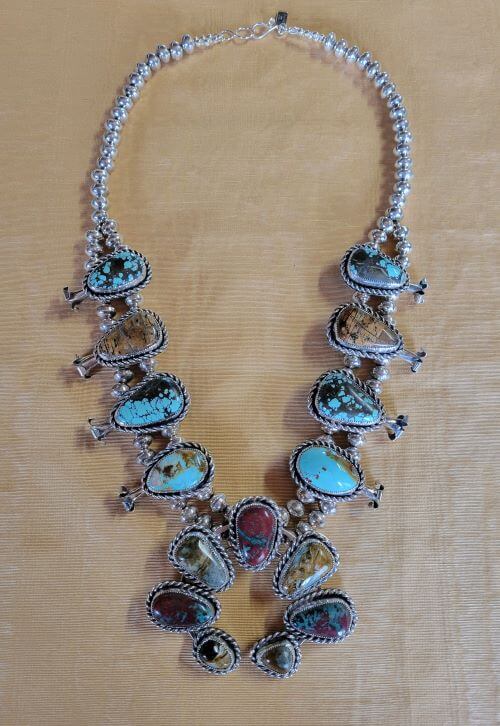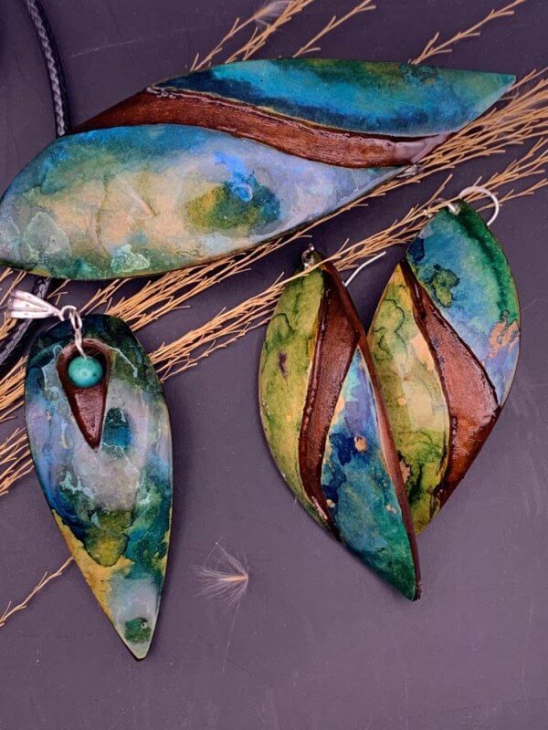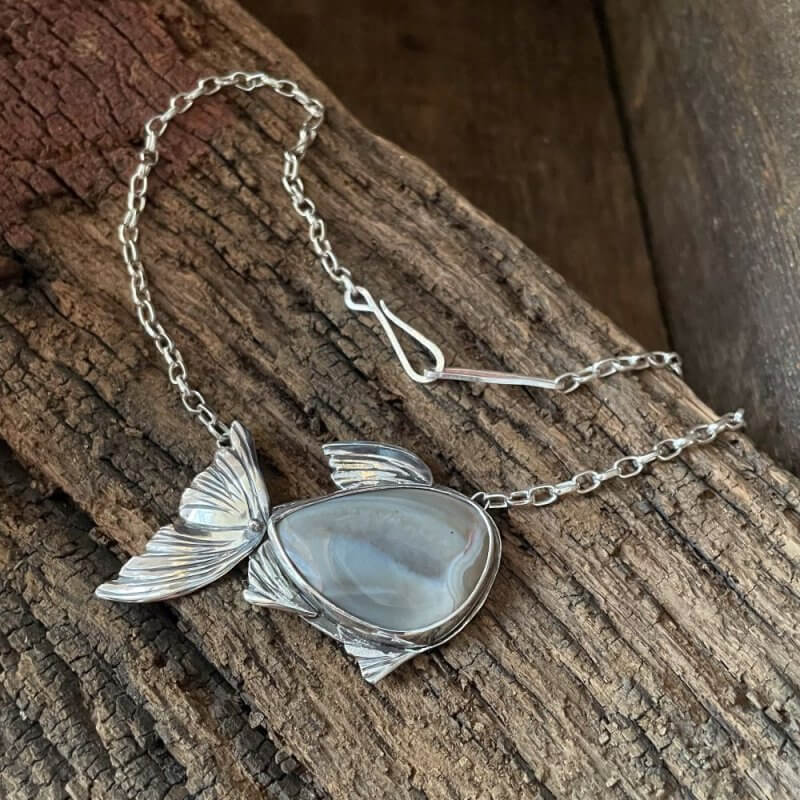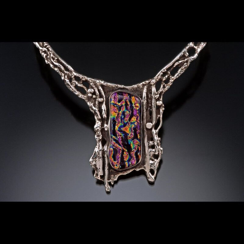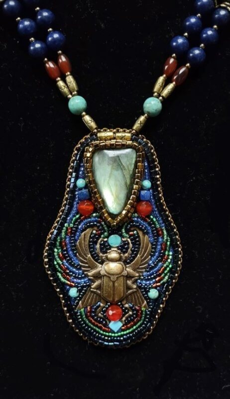 I create one-of-a-kind jewelry designs using semi-precious gemstones embroidered with seed beads, pearls and tiny gems. The pendants often resemble tiny mosaics.