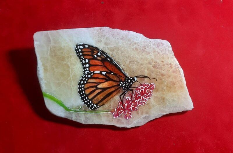 I use acrylic paint on a variety of stones, including Santorini Marble, Agates, Honeycomb Calcite, Labradorite, Red Onyx and river stones. These are sealed with 2-part epoxy resin.