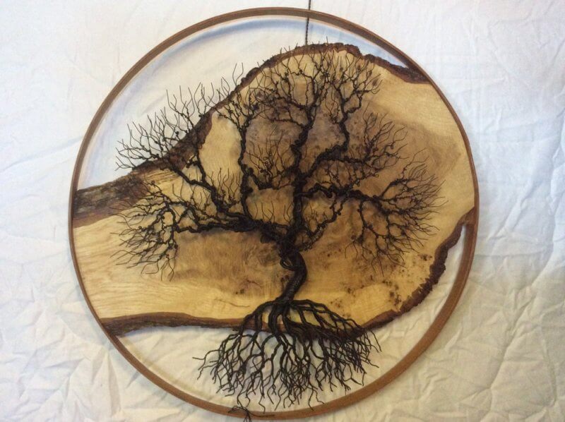 Hand twisted aluminum & copper wire, mounted alone or on slate or on wood. Cherry burl, Spalted, 50 other species. Mostly Japanese tools.