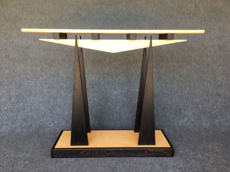 All designs original. Traditional joinery used. All surfaces sanded to 0000 steel wool. All work done by applicant. All woods are their natural colors & are nonendangered. Oil finish.