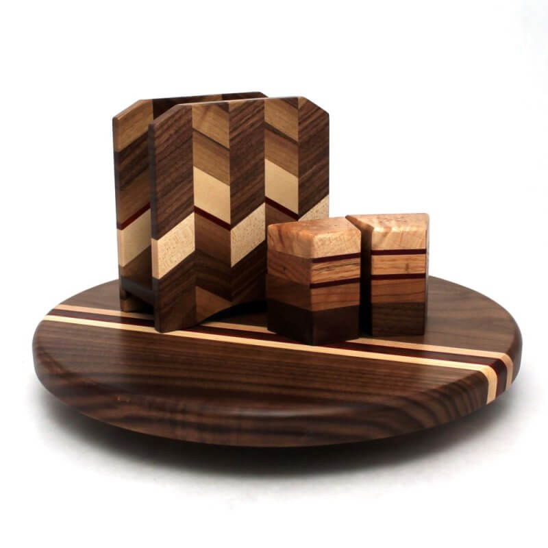 We hand cut and hand glue a variety of hardwoods creating functional artwork. Items include clipboards, chess boards and a variety of cutting boards.