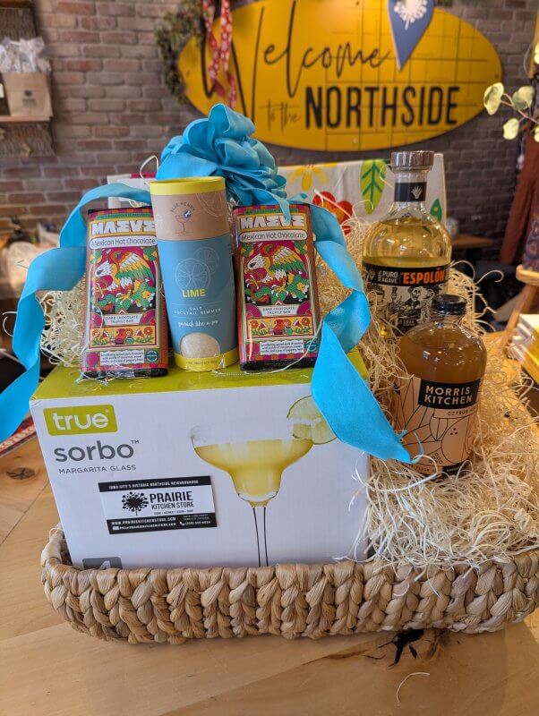 Prairie Kitchen Store – Margarita Gift Basket – Tequila, margarita glasses, towel, cocktail mixer, chocolate